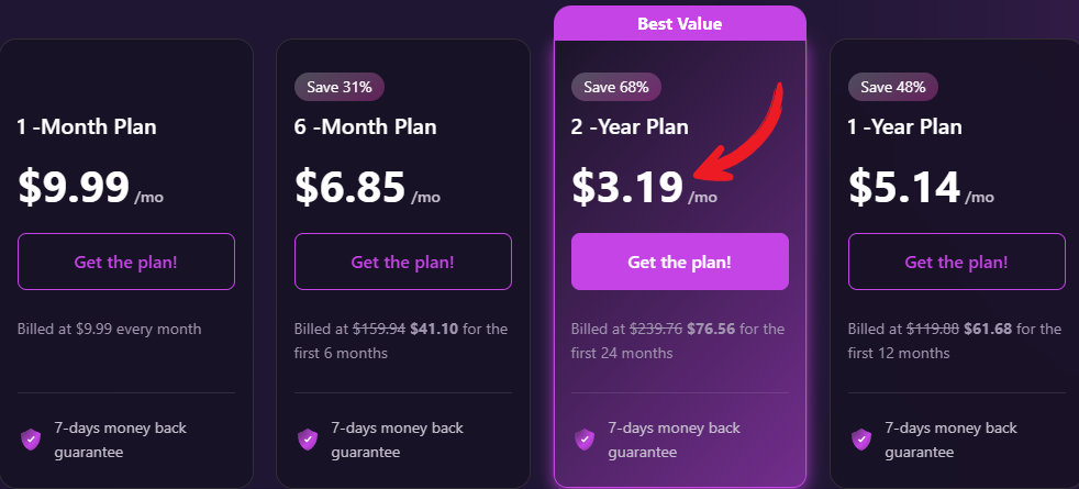• Starts around $2.19/month on long‑term (26–28 month) plans, single tier pricing—no hidden features behind tiers.