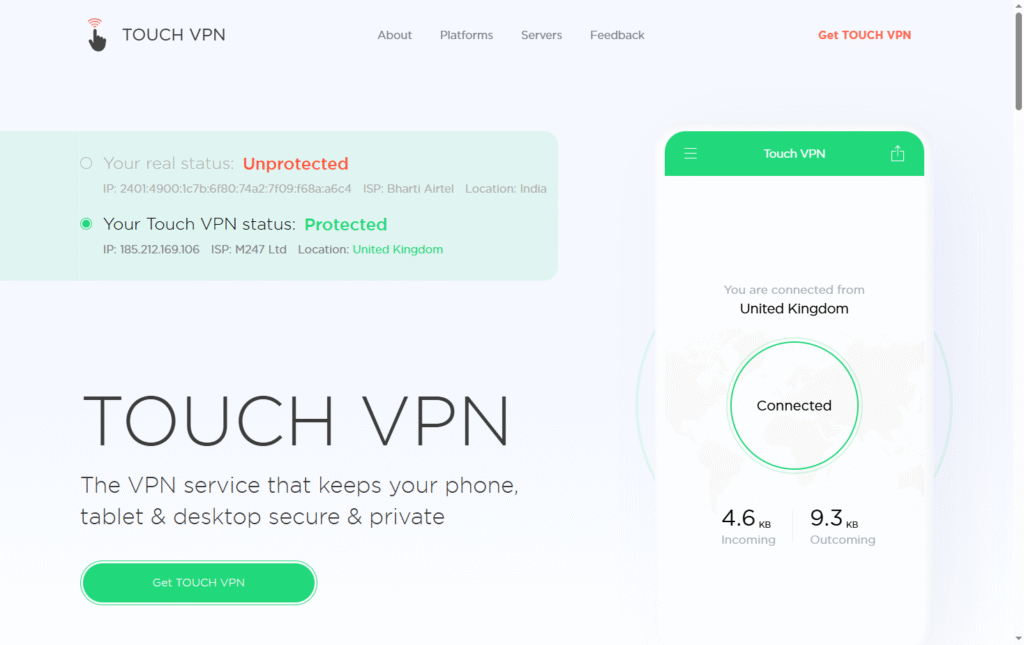 TouchVPN offers apps for major platforms with a beginner-friendly design and one-click connect functionality.